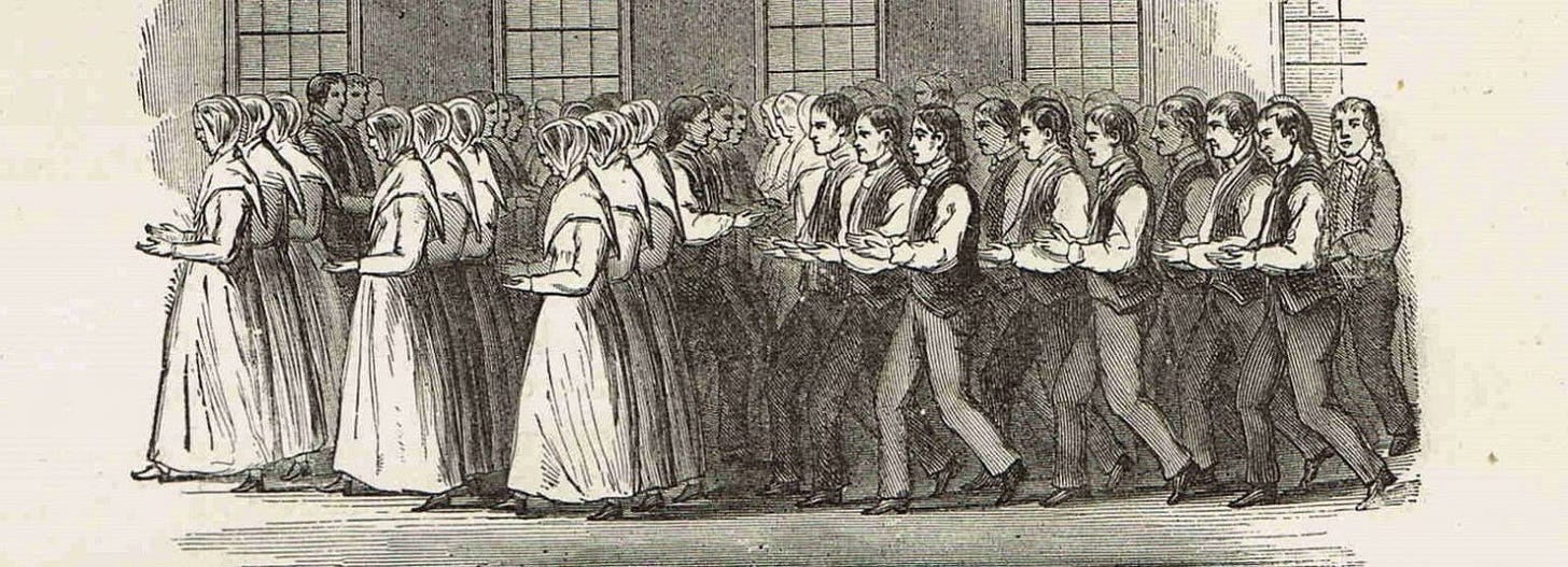 As Andrews explains in his annotated edition The Gift to be Simple, the Shaker custom of breaking into spontaneous song in the midst of sabbath prayers was held to be Mother Ann Herself beaming in from the beyond, making her presence felt in the possessed voices of “Mother’s little children” and “Mother’s little lambs.”