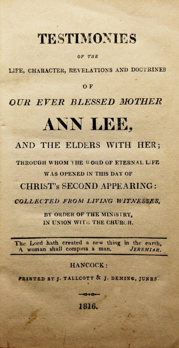 Testimonies – that’s the shorthand title right there. Hot off the letterpress in 1816, now rare as hen’s teeth. It’s the ultimate testament to Mother Ann’s millennarian magnetism.The full title says it all and then some: Testimonies of the Life, Character, Revelations and Doctrines of Our Ever Blessed Mother Ann Lee, and the Elders with Her, through whom the Word of Eternal Life was Opened in this Day of Christ’s Second Appearing, Collected from Living Witnesses, in Union with the Church.